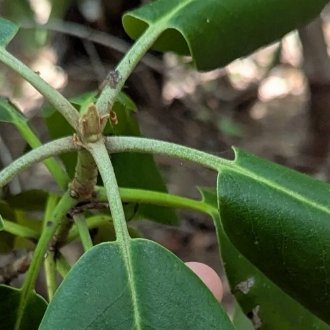 Leaf bases are usually rounded, occasionally even slightly heart-shaped; when leaf bases are tapered, they do so more broadly. Photo © Alina Martin, CC BY 4.0. | Leaf bases taper to a point, usually much more narrowly. Photo © Ken Clark, CC BY 4.0. |