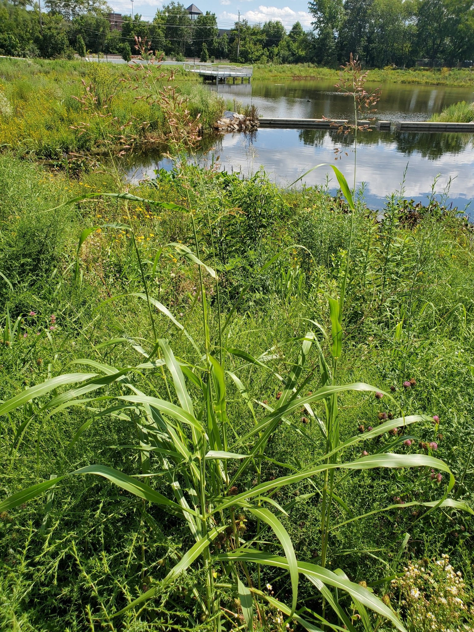 Johnsongrass (Sorghum halepense) is invading this meadow planting in Hillside Park in Newark, DE. This meadow, in a bottomland habitat around a pond, was planted with shorter species adapted to a drier climate and conditions, such as hoary vervain (Verbena stricta) and lanceleaf tickseed (Coreopsis lanceolata). Species like this are often chosen due to their showy flowers and shorter size, even if they are not ideally suited to the site. Predictably, the site was invaded by taller plants. Had the meadow been planted with taller species native to bottomlands in this region, the johnsongrass might not have been able to invade. Note that the native tall goldenrod (Solidago altissima) has also colonized this site.