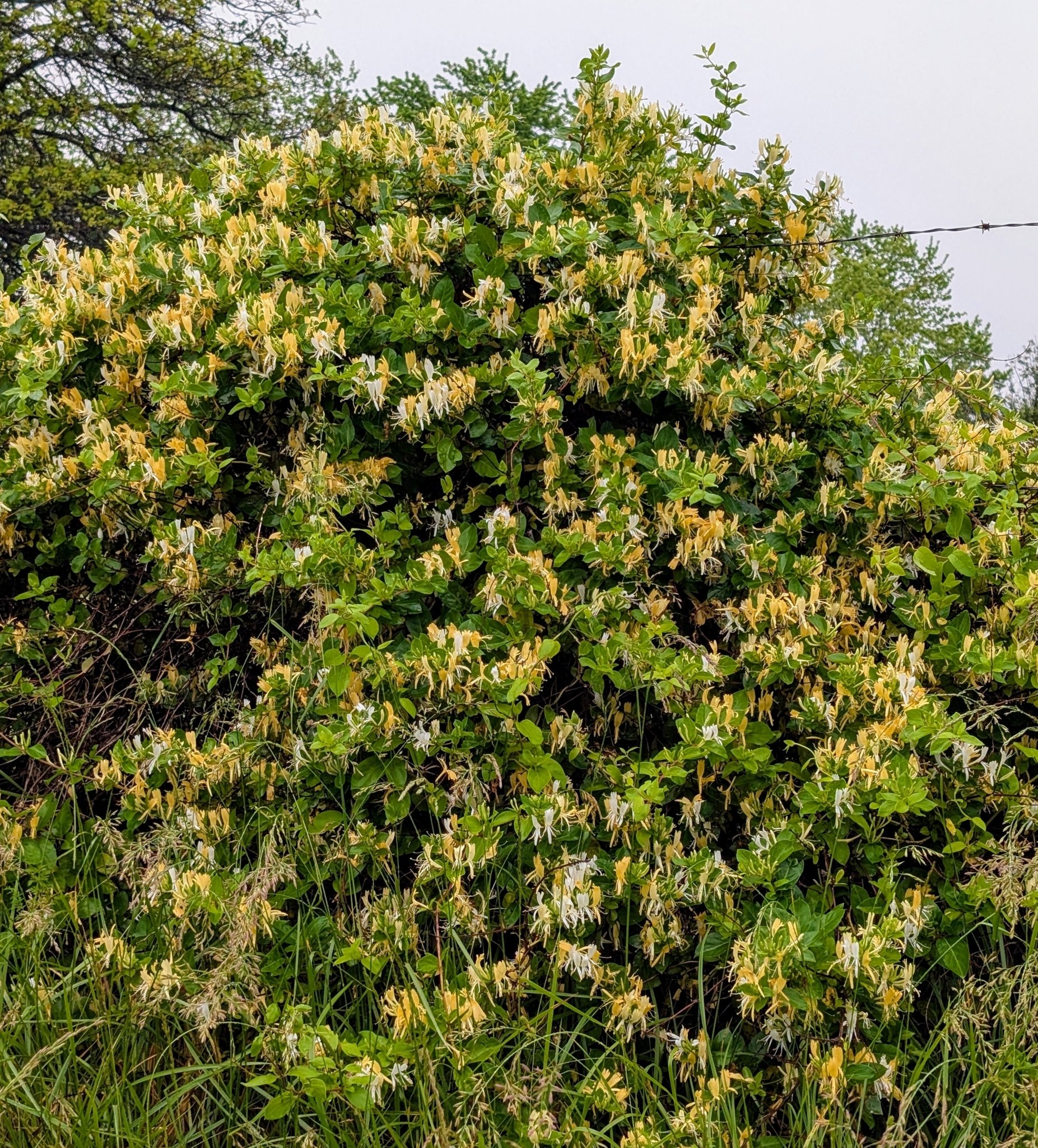This Japanese honeysuckle (Lonicera japonica) is growing on a roadside in Sherrill Township, Missouri, partly supported by a barbed-wire fence. Japanese honeysuckle, together with other invasive vines, often thrives along roadsides and other edge habitats where management practices remove ground-level herbaceous plants, but a vine rooted in a protected area farther back than the management zone is able to climb structures such as fences, trees, and shrubs, and then overhang the edge.