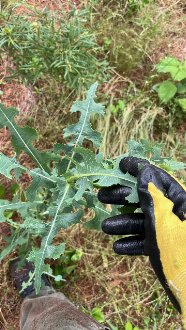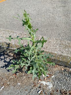This plant is highly variable in its growth habit, size, leaf shape, and other structures. Can grow up to 7' but usually much shorter. Leaves are alternate and clasping the stem at the base, variably lobed, ranging from unlobed to deeply cut with many lobes. Leaf margins are prickly, and prickles also run along the central vein. Unlike thistles, prickles are not usually stiff enough to puncture skin. The density of prickles is highly variable, ranging from dense to sparse; prickles tend to be densest in arid, wild habitats where pressure from herbivory is most intense. Leaves and stem both emit a milky white sap when cut.